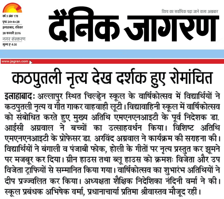 On 27.02.2016 Annual function of children school was celebrated, and the venue was “VidyaVahini” School M.G marg Civil lines. The function was organised under the guidance of Academic Director Mrs. Nandini Verma. Students from class Prep to 8th took part in function and performed various cultural programmes. The programme started with the lightning of lamp by Dr. I.C. Agarwal Former Diretor MNNIT, Allahabad. The Guest of Honour of the function was Dr. Arvind Agarwal Professor, Department of Physics MNNIT praised the children for their performance. The programme begun with Prayer of Maa Saraswati, several dance performance was given on the songs like Sun Raha hai na , O Papad Wale, Pinga, Bengali & Punjabi Folk songs, Puppet Dance, Sawar lu and holi. The Senior Students performed cultural Play which won the heart of all the Audience. During his speech Dr. I.C. Agarwal appreciated the children for their performance & gave his best wishes for their future. He also awarded the House Trophy to Green house as winner & Blue house as the 1st runner-up. The winners were decided on the basis of the points gained by the houses in a year. At the end of the programme the manager of the school Mr. Abhishek Verma, Principal Smt. Pratima Srivastava & Academic Director Mrs. Nandini Verma thanked the Chief Guest, Guest of Honour, parents & the Staff Members.