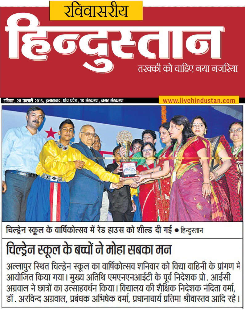 On 27.02.2016 Annual function of children school was celebrated, and the venue was “VidyaVahini” School M.G marg Civil lines. The function was organised under the guidance of Academic Director Mrs. Nandini Verma. Students from class Prep to 8th took part in function and performed various cultural programmes. The programme started with the lightning of lamp by Dr. I.C. Agarwal Former Diretor MNNIT, Allahabad. The Guest of Honour of the function was Dr. Arvind Agarwal Professor, Department of Physics MNNIT praised the children for their performance. The programme begun with Prayer of Maa Saraswati, several dance performance was given on the songs like Sun Raha hai na , O Papad Wale, Pinga, Bengali & Punjabi Folk songs, Puppet Dance, Sawar lu and holi. The Senior Students performed cultural Play which won the heart of all the Audience. During his speech Dr. I.C. Agarwal appreciated the children for their performance & gave his best wishes for their future. He also awarded the House Trophy to Green house as winner & Blue house as the 1st runner-up. The winners were decided on the basis of the points gained by the houses in a year. At the end of the programme the manager of the school Mr. Abhishek Verma, Principal Smt. Pratima Srivastava & Academic Director Mrs. Nandini Verma thanked the Chief Guest, Guest of Honour, parents & the Staff Members.