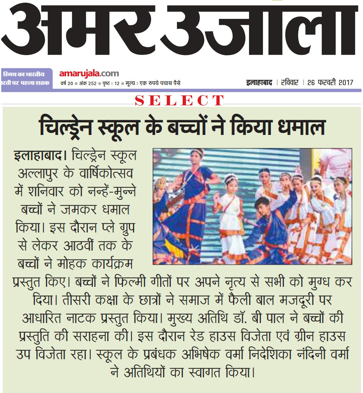 On 25.02.2017 Children School have celebrated his 15 years of excellence, and the venue was “VidyaVahini” School M.G marg Civil lines. The function was organised under the guidance of Academic Director Mrs. Nandini Verma. The programme started with the lightning of lamp by Padam Shree Dr. B. Paul Thaliath. Students from class playgroup to VIII have presented cultural programmes and charmed the audience. Firstly students have presented saraswati vandana. After this students of class III presented a play on child labour. School Manager Abhishek Verma have given detailed information of the School from the beginning. Chief guest B. Paul gives his blessings to the students. He also awarded the House Trophy to Red house as winner & Green house as the 1st runner-up. The winners were decided on the basis of the points gained by the houses in a year. At the end of the programme the manager of the school Mr. Abhishek Verma, Principal Smt. Pratima Srivastava & Academic Director Mrs. Nandini Verma thanked to the Chief Guest, parents & the Staff Members.