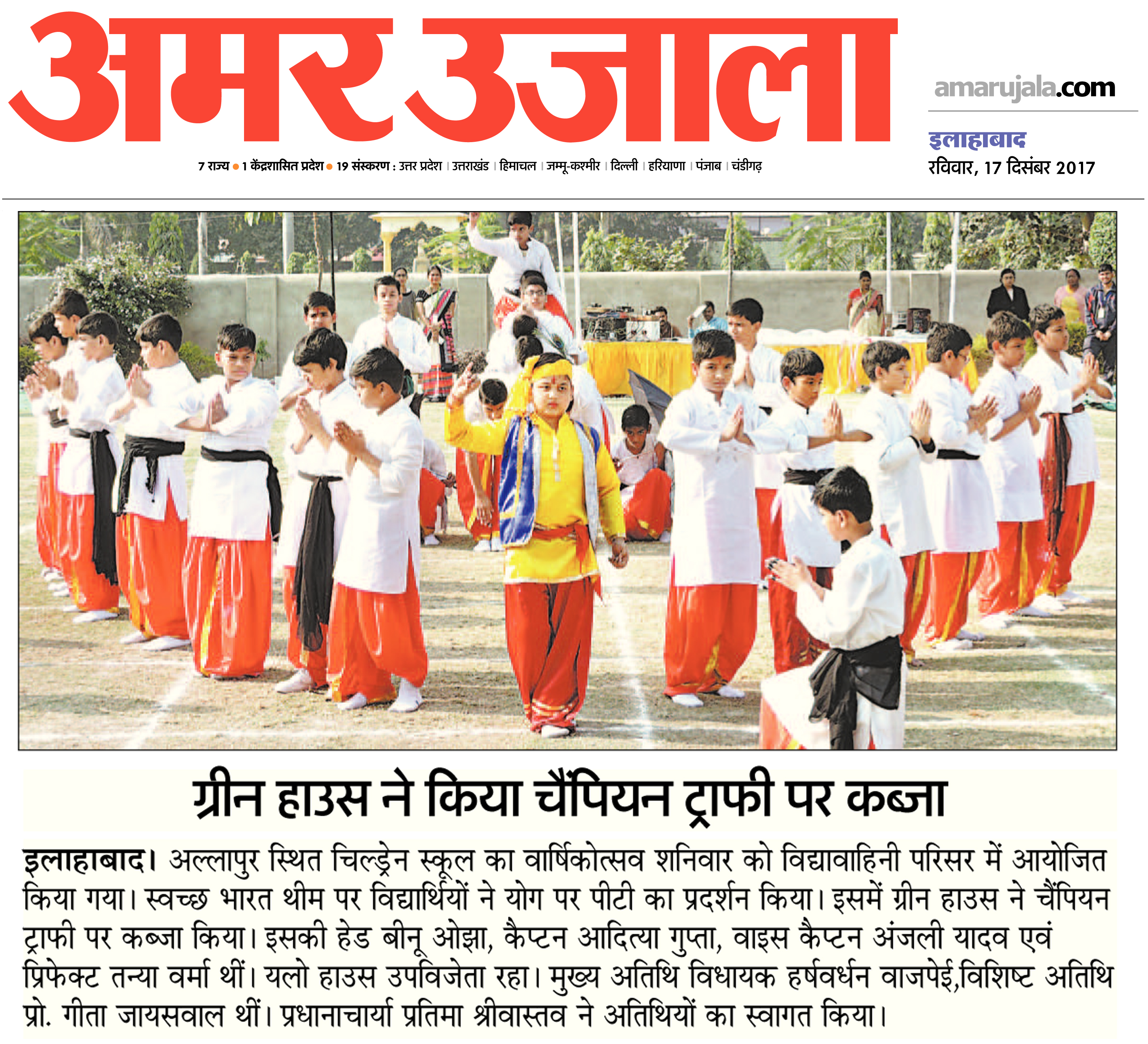 Annual Sports Day of Children School, Allahabad was celebrated with panoply on Saturday(16-12-2017). In the beginning, School Principal Mrs. Pratima Srivastava welcomed the Chief Guest, Er. Harshvardhan Bajpai MLA of Northern Allahabad, Guest of Honour Mr. Manish Chaturvedi, Unit Dainik Jagaran and Dr. Geeta Jaiswal, Retired Professor of Moti Lal Nehru Medical College. Er. Harshvardhan Bajpai lit the torch and told the inevitability of sports in the life of children. The students of all the four houses took out a march past at Vidya Vahini Campus. In sports meet students participated in various types of race competitions, including Cross the River Race, Martial Arts, Balance the Cone, Hula Hope Race, Crown Race etc. The Race of Children School's students had entertained audiences and young children also got the attention of everyone with their favored efforts, among them Kathak PT, Parachute Drill, Funny-Bunny Race were main. Children of senior classes gave a message to fight for the conflict in life by creating a pyramid. Chief Guest congratulated the Prize winners and Runner-up while giving the Awards. ‘Green House’ was the winner under House Champion trophy, House Head Shrimati Binu Ojha, Captain Aditya Gupta, Vice Captain Anjali Yadav, Prefect Tanya Verma and Runners-up was ‘Yellow House’, House Head Mrs. Seema Rai, Captain Ishat Srivastava, Vice Captain Samriddhi Verma, Prefect Palak Gupta. Lastly, Manager of Children School Mr. Abhishek Verma appreciated the tireless efforts of all the teachers, employees and students of the school and thanked them for all.