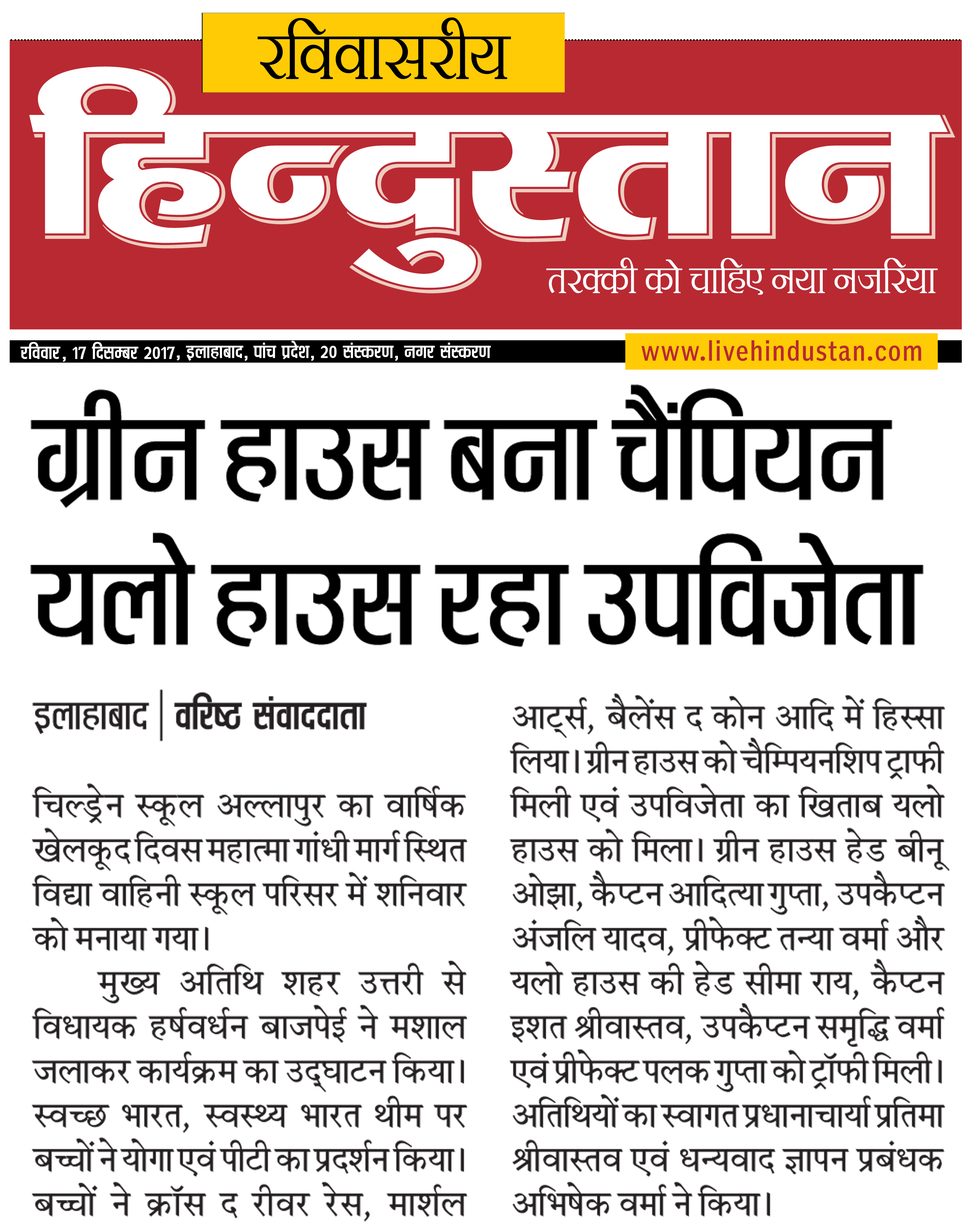 Annual Sports Day of Children School, Allahabad was celebrated with panoply on Saturday(16-12-2017). In the beginning, School Principal Mrs. Pratima Srivastava welcomed the Chief Guest, Er. Harshvardhan Bajpai MLA of Northern Allahabad, Guest of Honour Mr. Manish Chaturvedi, Unit Dainik Jagaran and Dr. Geeta Jaiswal, Retired Professor of Moti Lal Nehru Medical College. Er. Harshvardhan Bajpai lit the torch and told the inevitability of sports in the life of children. The students of all the four houses took out a march past at Vidya Vahini Campus. In sports meet students participated in various types of race competitions, including Cross the River Race, Martial Arts, Balance the Cone, Hula Hope Race, Crown Race etc. The Race of Children School's students had entertained audiences and young children also got the attention of everyone with their favored efforts, among them Kathak PT, Parachute Drill, Funny-Bunny Race were main. Children of senior classes gave a message to fight for the conflict in life by creating a pyramid. Chief Guest congratulated the Prize winners and Runner-up while giving the Awards. ‘Green House’ was the winner under House Champion trophy, House Head Shrimati Binu Ojha, Captain Aditya Gupta, Vice Captain Anjali Yadav, Prefect Tanya Verma and Runners-up was ‘Yellow House’, House Head Mrs. Seema Rai, Captain Ishat Srivastava, Vice Captain Samriddhi Verma, Prefect Palak Gupta. Lastly, Manager of Children School Mr. Abhishek Verma appreciated the tireless efforts of all the teachers, employees and students of the school and thanked them for all.