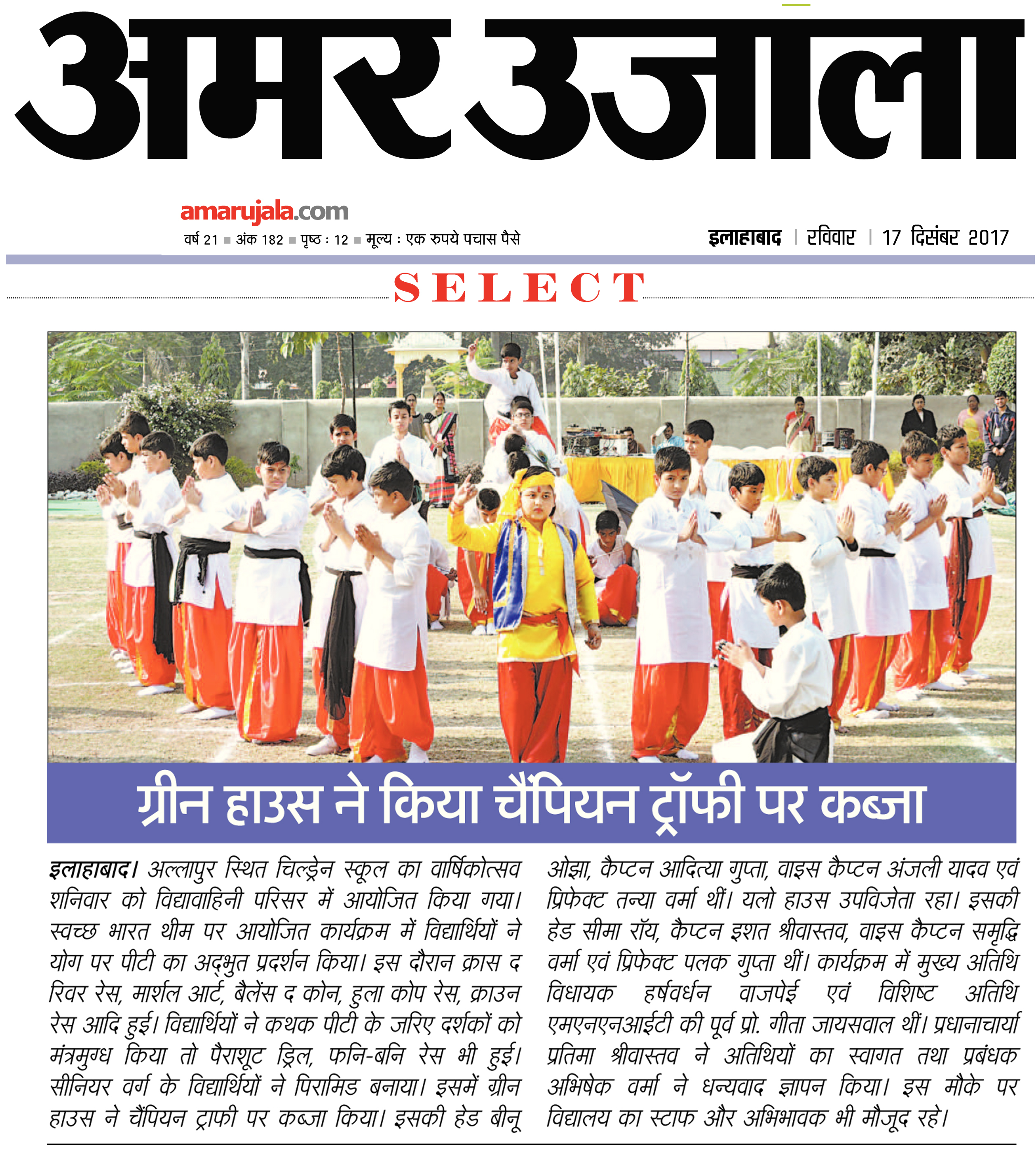 Annual Sports Day of Children School, Allahabad was celebrated with panoply on Saturday(16-12-2017). In the beginning, School Principal Mrs. Pratima Srivastava welcomed the Chief Guest, Er. Harshvardhan Bajpai MLA of Northern Allahabad, Guest of Honour Mr. Manish Chaturvedi, Unit Dainik Jagaran and Dr. Geeta Jaiswal, Retired Professor of Moti Lal Nehru Medical College. Er. Harshvardhan Bajpai lit the torch and told the inevitability of sports in the life of children. The students of all the four houses took out a march past at Vidya Vahini Campus. In sports meet students participated in various types of race competitions, including Cross the River Race, Martial Arts, Balance the Cone, Hula Hope Race, Crown Race etc. The Race of Children School's students had entertained audiences and young children also got the attention of everyone with their favored efforts, among them Kathak PT, Parachute Drill, Funny-Bunny Race were main. Children of senior classes gave a message to fight for the conflict in life by creating a pyramid. Chief Guest congratulated the Prize winners and Runner-up while giving the Awards. ‘Green House’ was the winner under House Champion trophy, House Head Shrimati Binu Ojha, Captain Aditya Gupta, Vice Captain Anjali Yadav, Prefect Tanya Verma and Runners-up was ‘Yellow House’, House Head Mrs. Seema Rai, Captain Ishat Srivastava, Vice Captain Samriddhi Verma, Prefect Palak Gupta. Lastly, Manager of Children School Mr. Abhishek Verma appreciated the tireless efforts of all the teachers, employees and students of the school and thanked them for all.