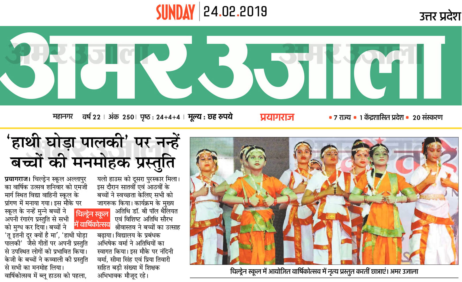 The Annual Festival of Children School, Allahapur was celebrated on Saturday in the premises of the Vidya Vahini School situated on MG Marg. On this occasion, the youngsters of the school enchanted the audience with their colorful presentation. The children influenced the people present with their presentation on songs such as "Tu itni door kyoun hai maa", "Hathi Ghoda Palki". KG's student made a conquest everyone by the presentation of the qawwali. The students of VII and VIII made everyone aware of the need for cleanliness, during the program. The guest of the program, Dr. B. Paul Talaiyat and the special guest Mr. Saurabh Shrivastav extended the enthusiasm of the children. He also awarded the House Trophy to Blue house as winner & Yellow house as the 1st runner-up. The winners were decided on the basis of the points gained by the houses in a year. School Manager Mr. At the end of the programme the manager of the school Mr. Abhishek Verma, Principal Smt. Pratima Srivastava & Academic Director Mrs. Nandini Verma thanked to the Chief Guest, parents & the Staff Members.