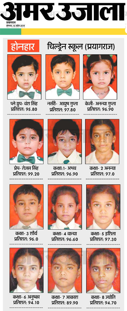 Promising Students of Children School (Prayagraj) Play Group-Yash Singh (95.80%), Nursery- Ayush Gupta (97.80%), KG- Ananya Gupta (96.90%), Prep- Tejas Singh (99.20%), Class 1st- Aabhav (96.90%), Class 2nd- Ananya (97%), Class 3rd- Shaurya (96%), Class 4th- Tanya- (96.60%), Class 5th- Ishita (97.30%), Class 6th- Anushka (94.10%), Class 7th- Akash (89.90%) and Class 8th- Jyoti (94.70%)